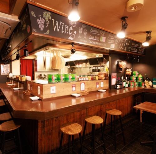 【オープンキッチンで織りなす料理の数々が、目の前で楽しめるワイン酒場】当店は、こじゃれた雰囲気の中で、シェフの技を間近で感じながら、心温まるお料理をお楽しみいただけます♪スタッフとも気軽に交流できるため、特別な時間を過ごせること間違いなし☆15名様~最大23名様までの貸切利用も可能です◎